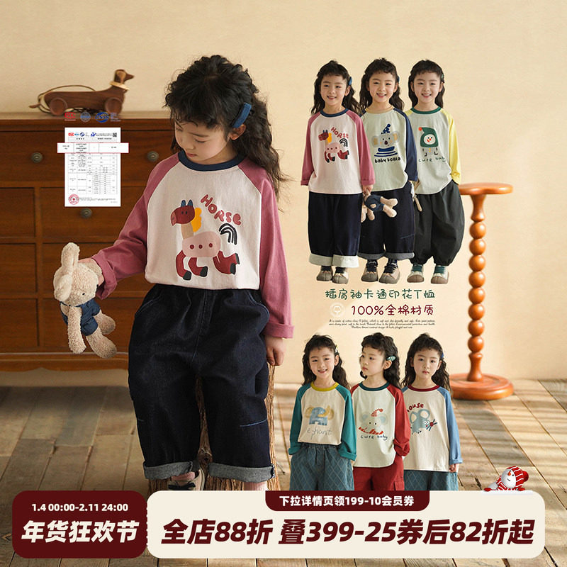 女童纯棉长袖T恤春秋新款拼色印花插肩打底衫女宝卡通时尚上衣潮