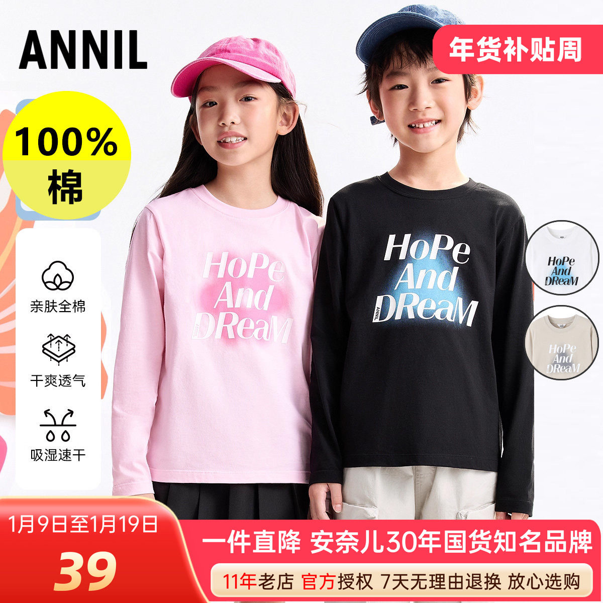 【全棉速干T】安奈儿男女童纯棉长袖T恤针织衫2025秋新款圆领打底