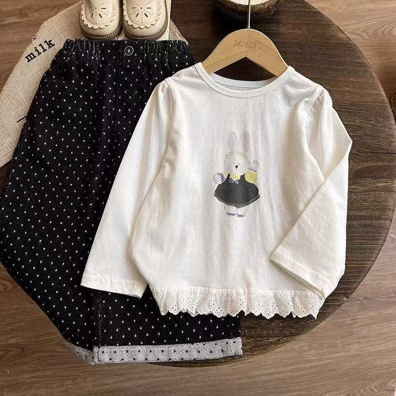 女童纯棉长袖t恤春秋2025新款中大童卡通甜美花边圆领打底衫休闲