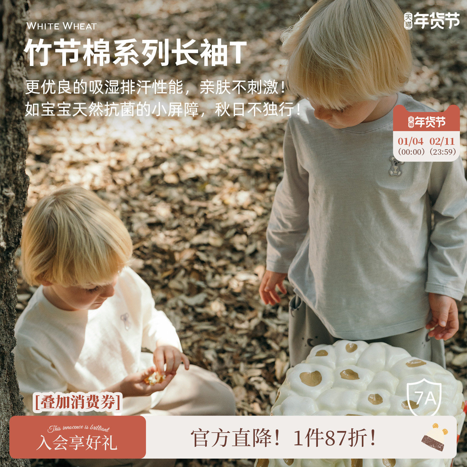 whitewheat儿童2025秋季新款上衣竹节棉抗菌男孩女童纯棉长袖T恤