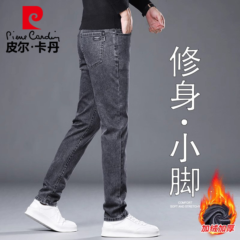 皮尔卡丹冬季新款加绒加厚牛仔裤男士修身小脚外穿百搭弹力长裤子