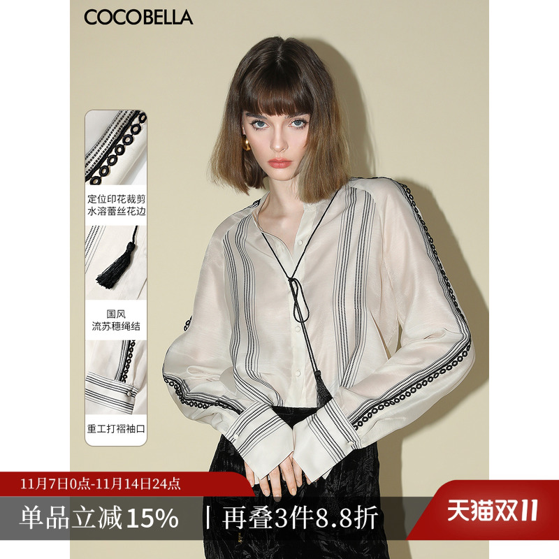 COCOBELLA蕾丝拼接条纹衬衫女秋气质通勤立领长袖衬衣SR0015-2