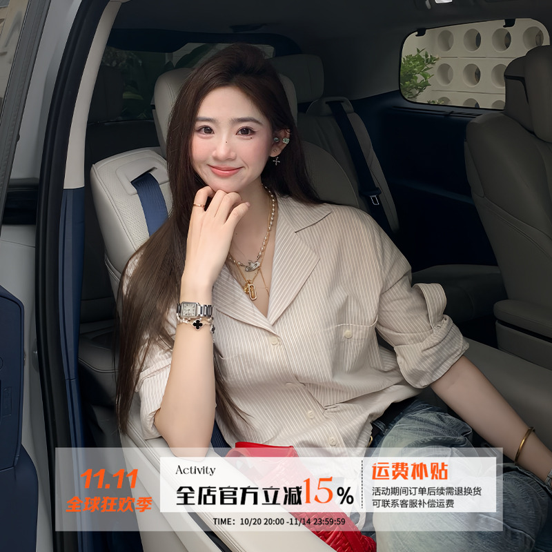 万有引力博物馆 条纹衬衫女秋季薄款2025年新款宽松早秋天丝外套