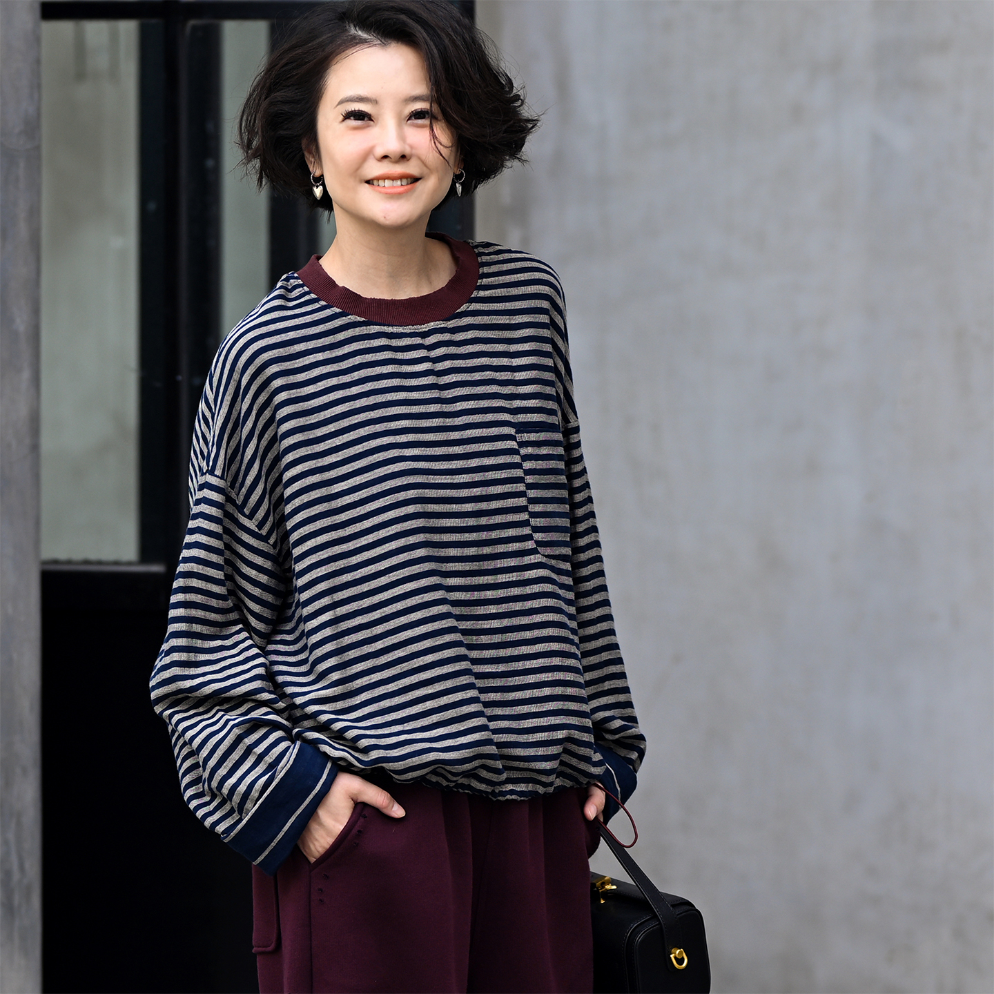 包邮特●C57573 文艺休闲拼色圆领双纱纯棉宽松套头条纹衬衫女秋