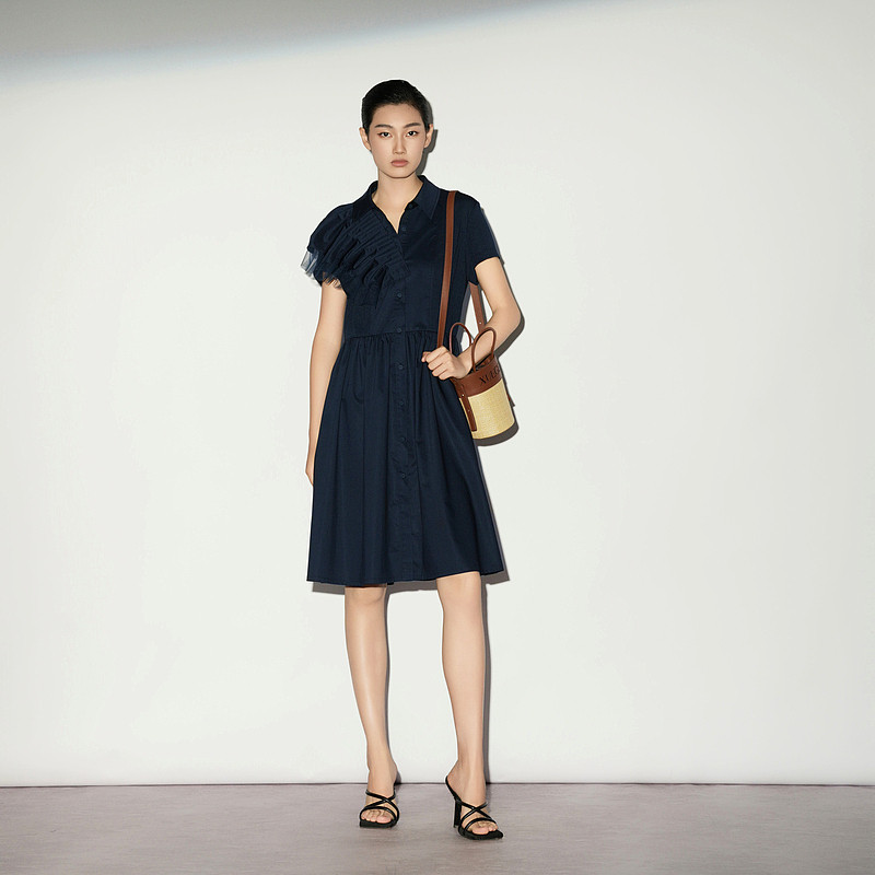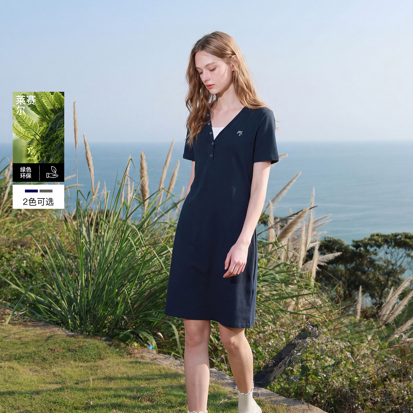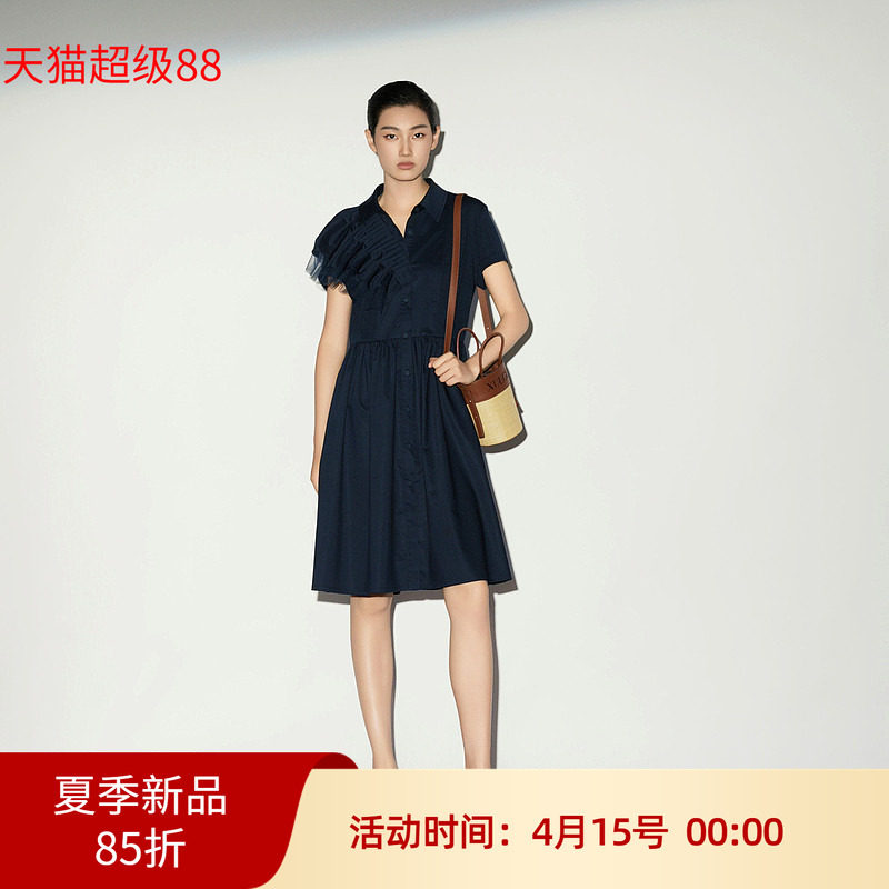 XG/雪歌26夏款简约衬衫领短袖气质连衣裙女收腰中裙XL204008A328