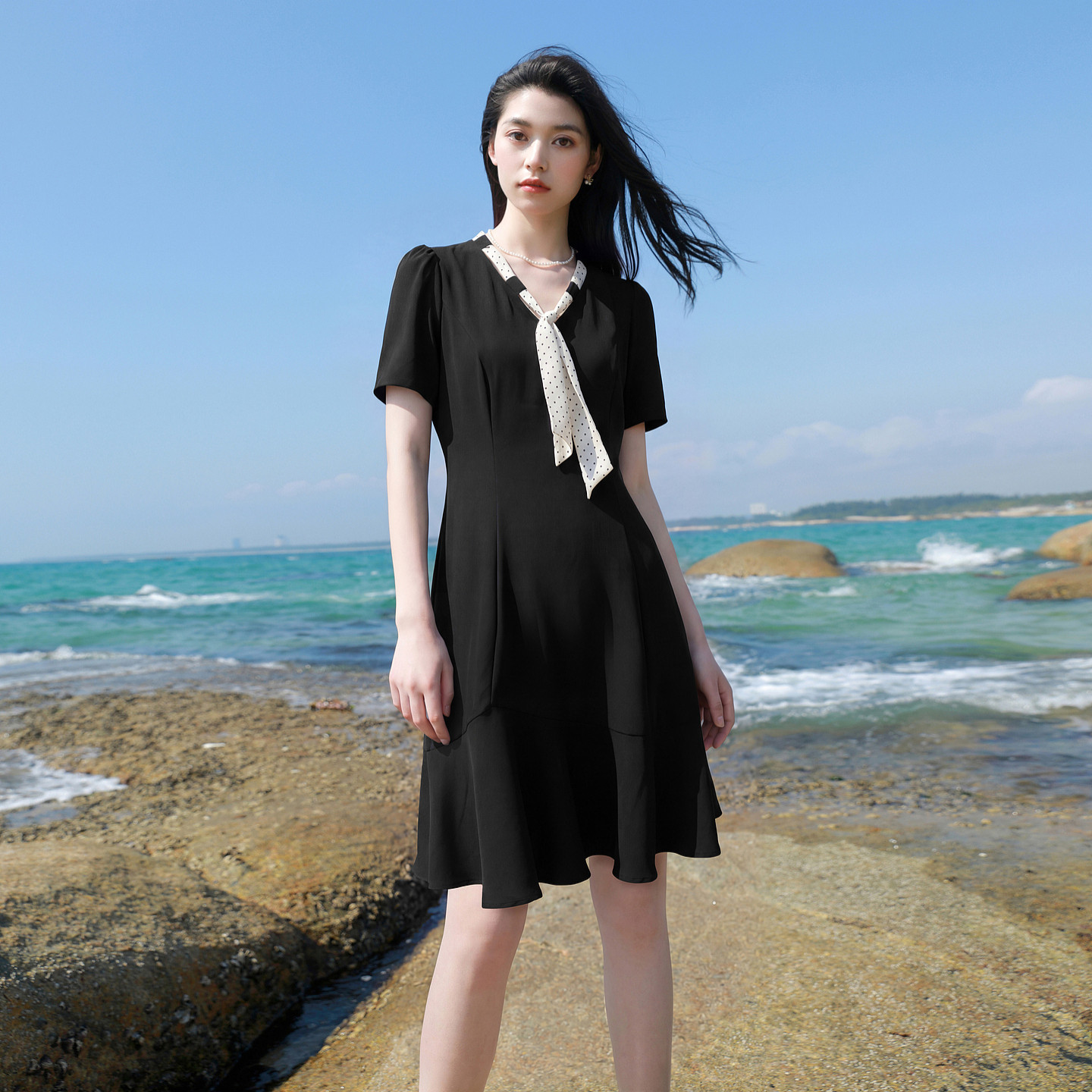 若潮大码女装2026夏季新款V领连衣裙收腰黑色中裙短袖胖MM