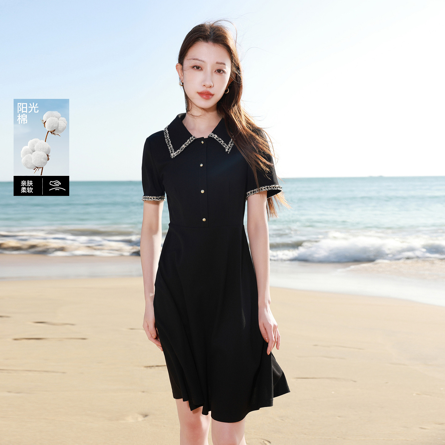 若潮大码女装2026夏季新款香风连衣裙收腰A字中裙黑色胖MM