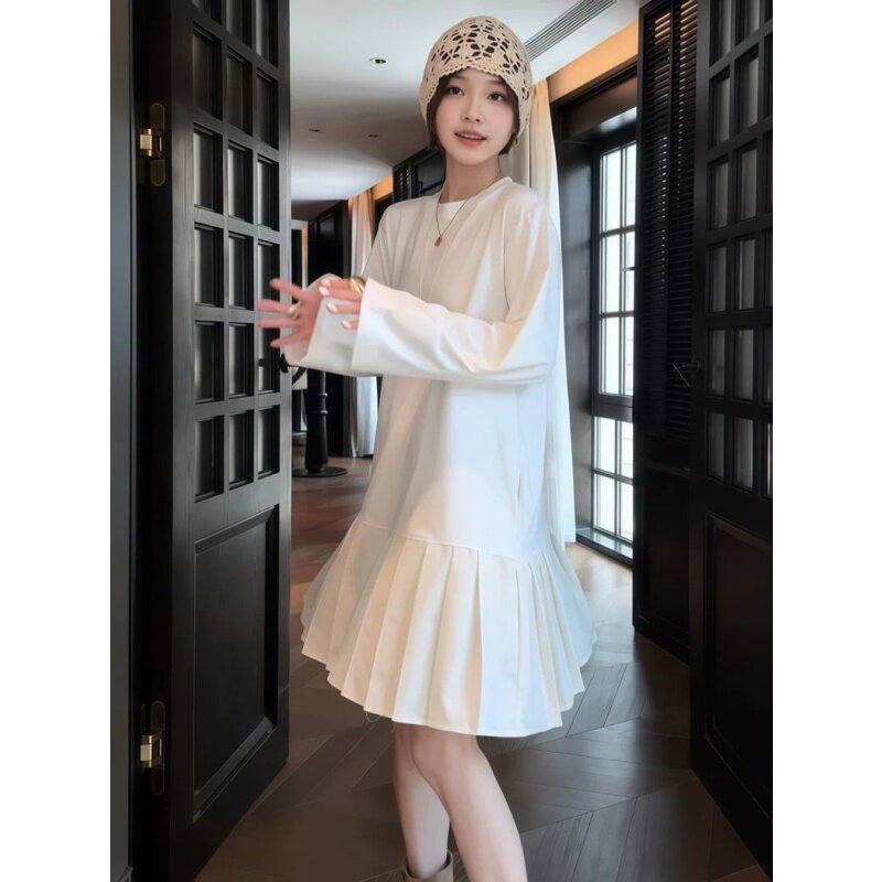 韩系时尚慵懒风气质长袖连衣裙夏季加大码300斤胖MM百褶高级中裙