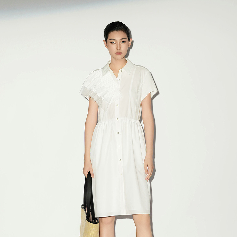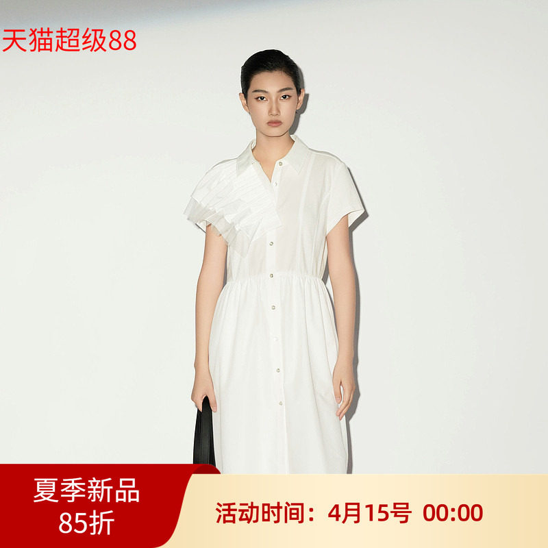 XG/雪歌26夏白色衬衫气质中裙女短袖翻领收腰连衣裙XL204009A351