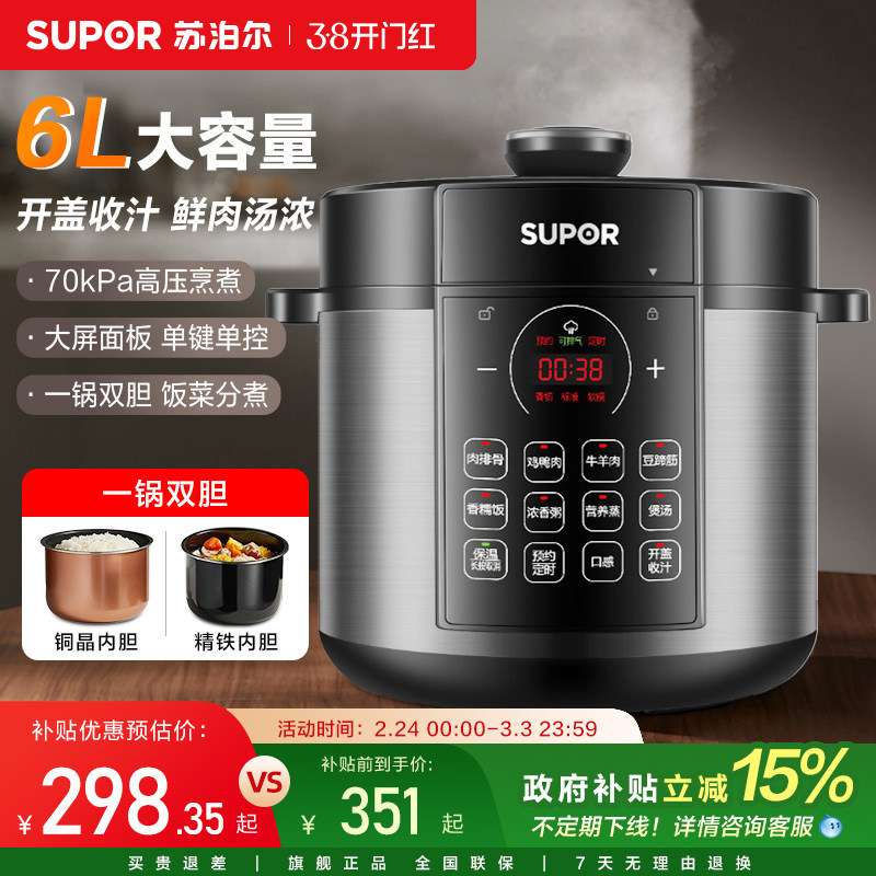苏泊尔电压力锅家用大容量智能6L高压饭煲多功能饭锅双胆高压锅