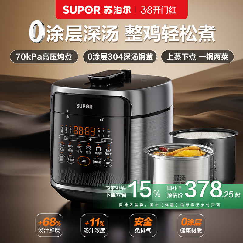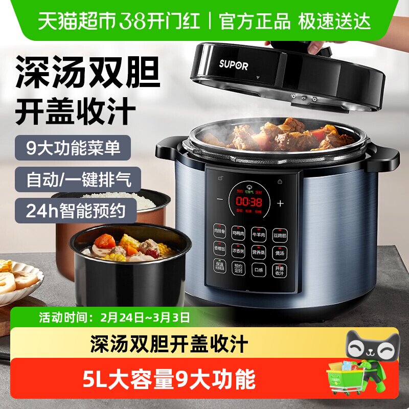 苏泊尔电压力锅家用高压锅0涂层深汤锅双胆上蒸下煮智能5L大容量