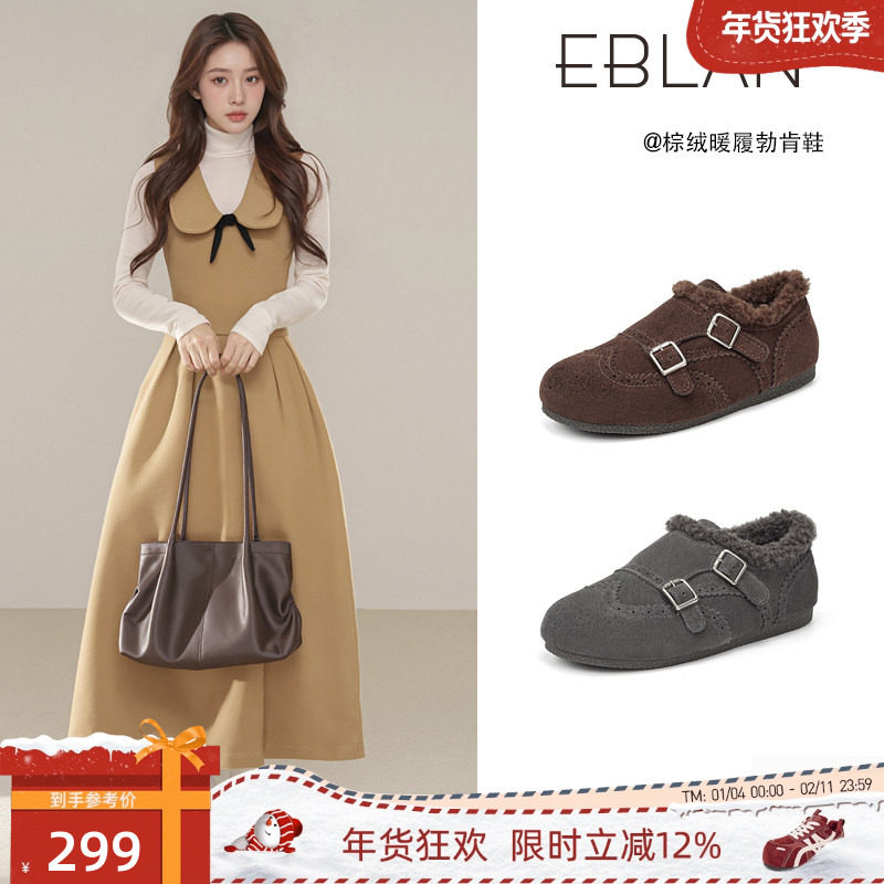 EBLAN/伊伴厚底布洛克勃肯鞋女2025冬季新款加绒保暖毛毛乐福棉鞋