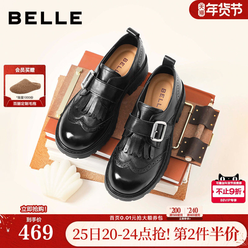 百丽英伦风孟克乐福鞋女26新款雕花布洛克真皮厚底小皮单鞋B3030