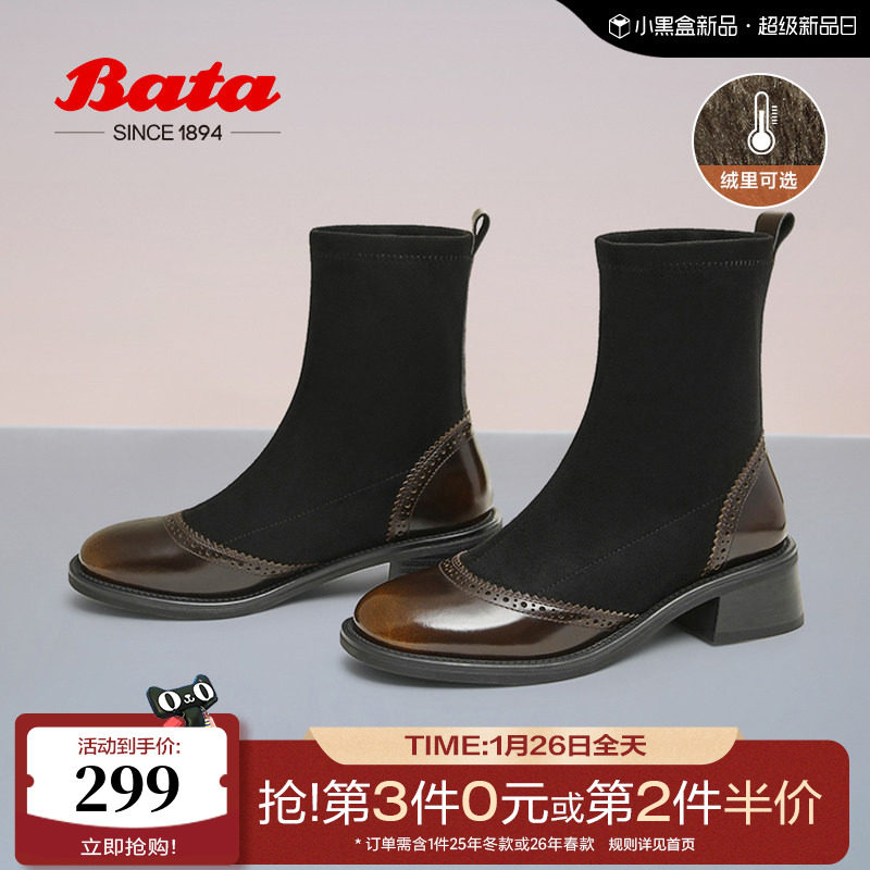 Bata布洛克袜靴女冬新款粗跟时尚短筒瘦瘦靴49056DD4