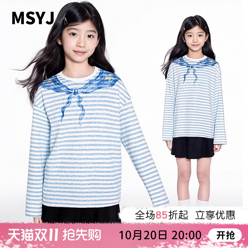 MSYJ 蓝色条纹T恤长袖女童秋季宽松圆领休闲海军风设计感上衣