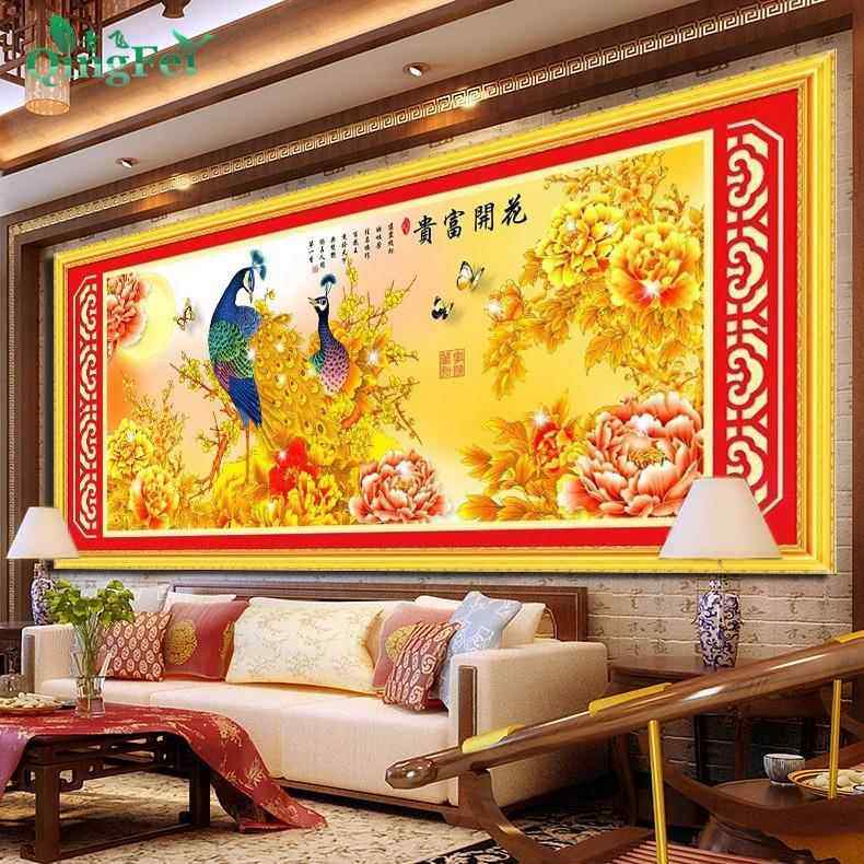 青飞新款花开富贵黄金版孔雀十字绣孔雀牡丹富贵吉祥客厅横幅大画