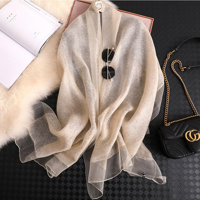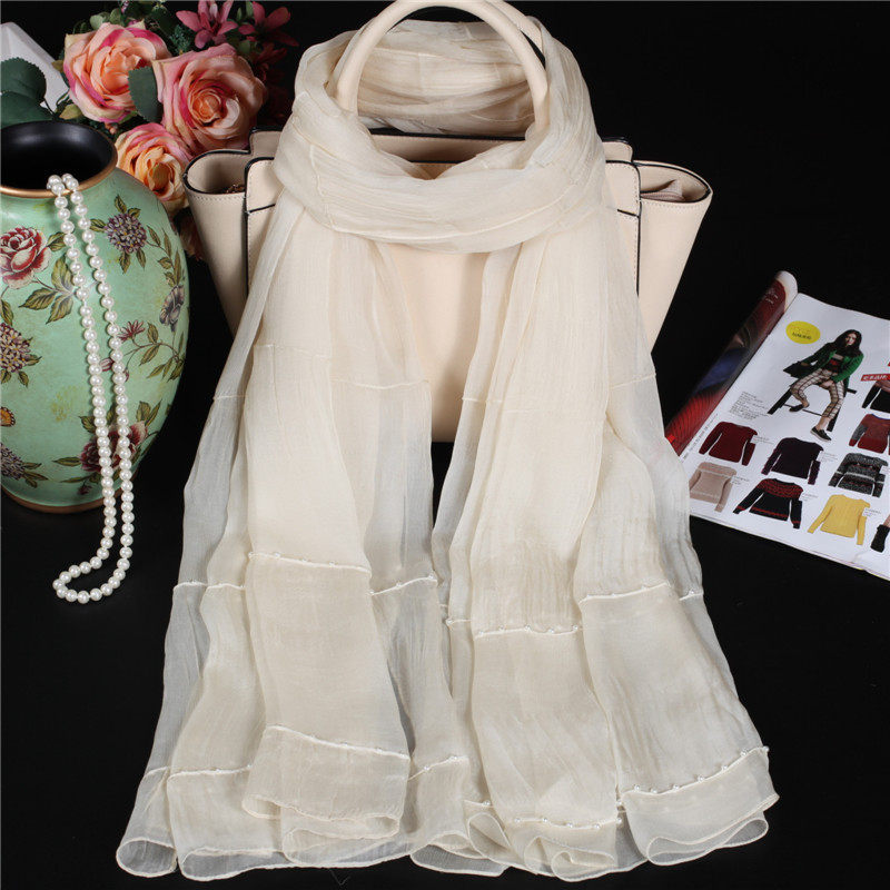 韩国高档纯色钉珠真丝围巾女100%桑蚕丝巾春秋冬杭州皱披肩米白色
