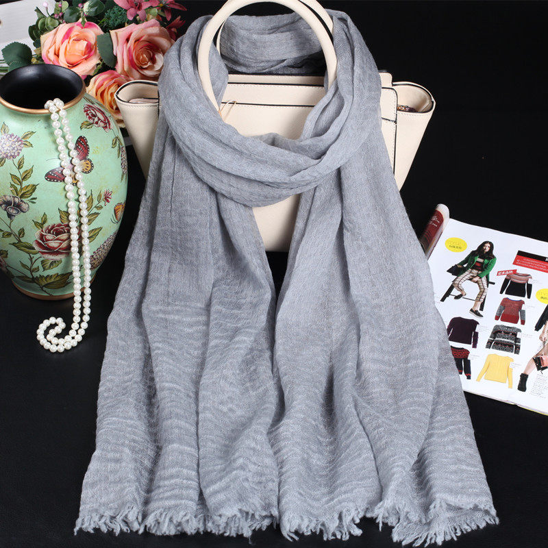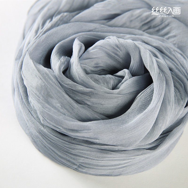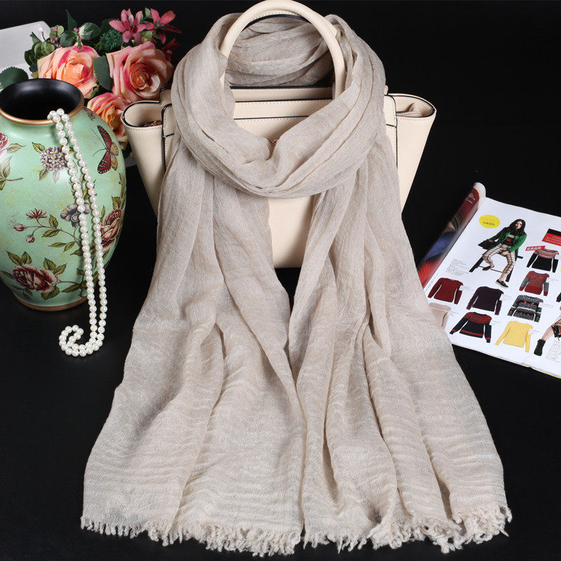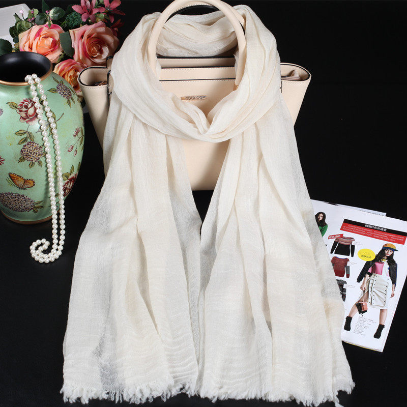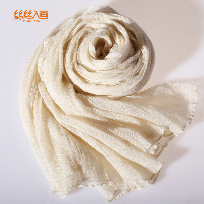 时尚韩国新款皱真丝围巾春秋冬季100%桑蚕丝巾长款纯色披肩米白色