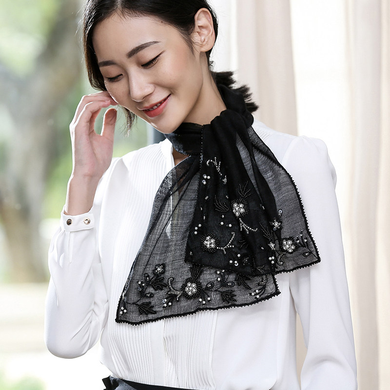 日系高档纯色手工钉珠刺绣真丝羊毛小丝巾围巾女春秋百搭细窄长条