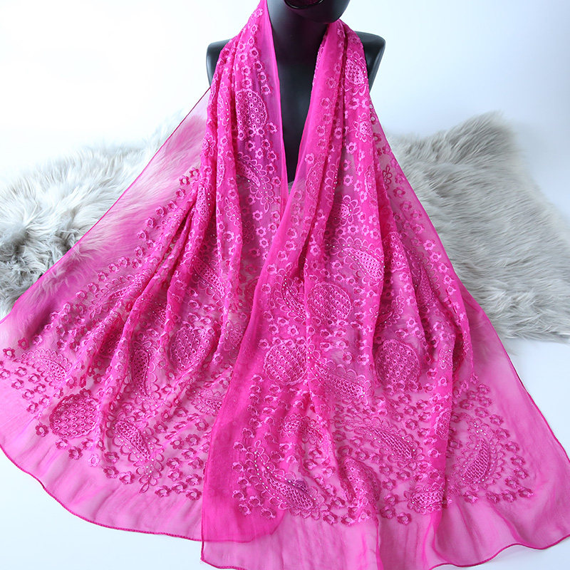 真丝丝巾女春秋长款薄款刺绣穿珠纯色高档礼品玫红色蚕丝围巾秋冬