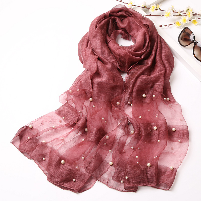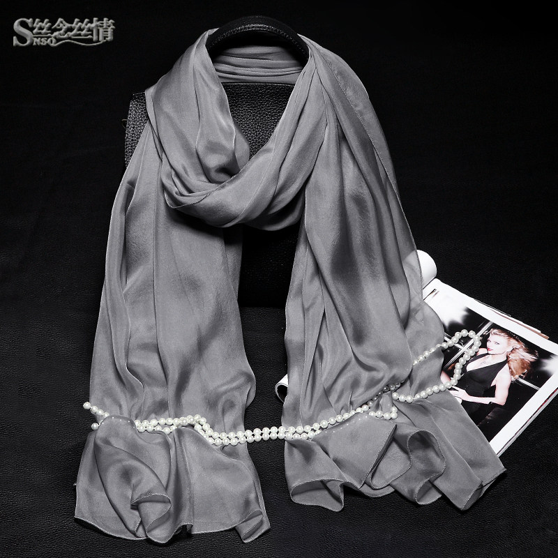 2023百搭新款 春秋女士高档纯色桑蚕丝丝巾 淑女珍珠真丝羊毛围巾