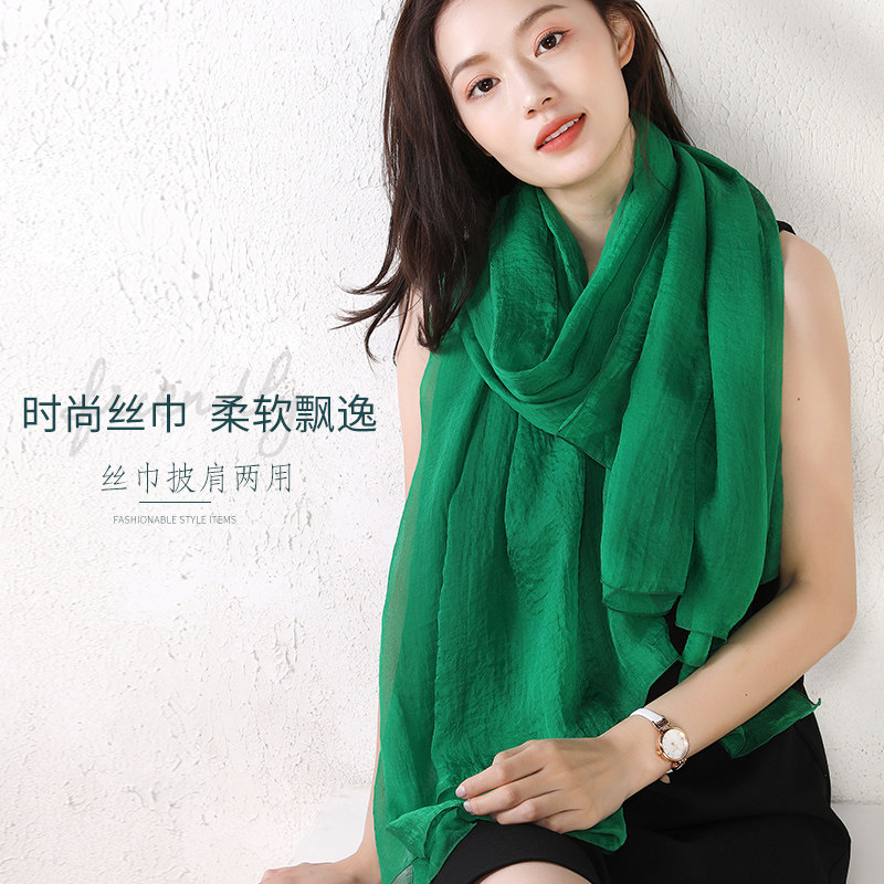 纯色真丝长款丝巾桑蚕丝高档薄款围巾春冬纱巾披肩两用女加皱草绿