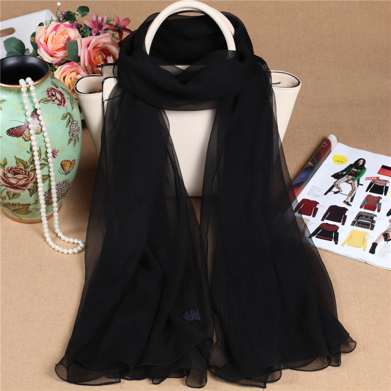 真丝围巾长款百搭纯色春秋冬季100%高档桑蚕丝丝巾女披肩两用黑色