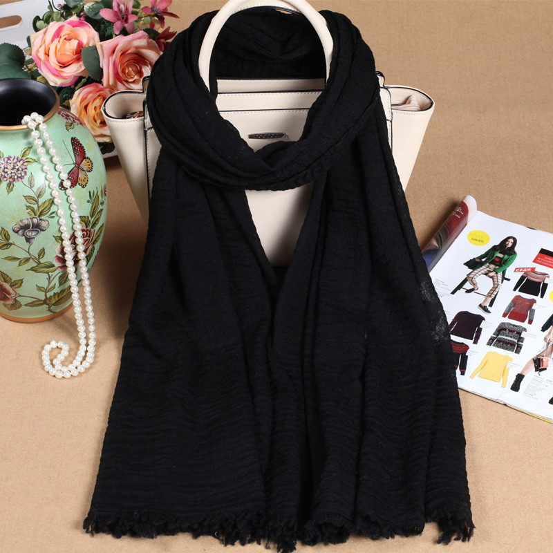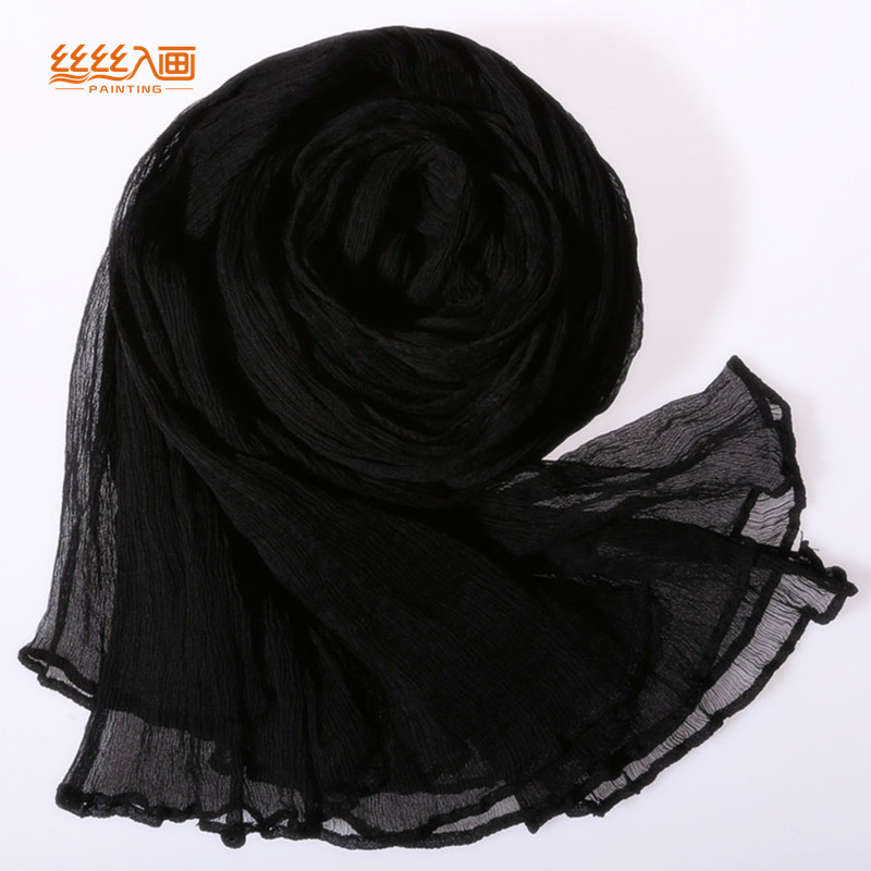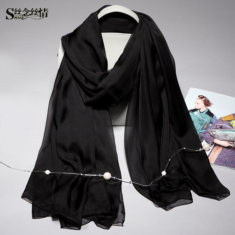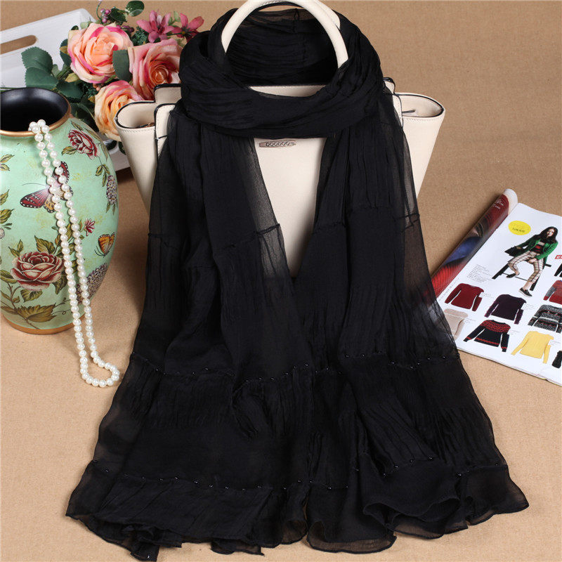 韩国高档纯色钉珠真丝围巾女100%桑蚕丝巾春秋冬杭州皱披肩黑色