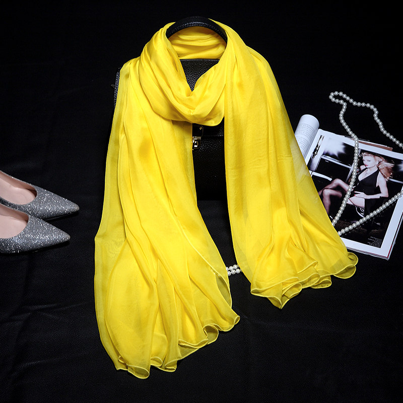 真丝围巾长款百搭纯色防晒100%高档桑蚕丝丝巾女披肩沙滩两用黄色