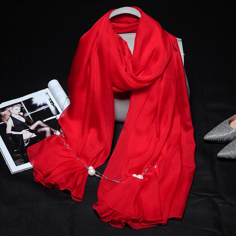真丝丝巾女高档长款夏季百搭纯色防晒桑蚕丝围巾披肩沙滩两用红色
