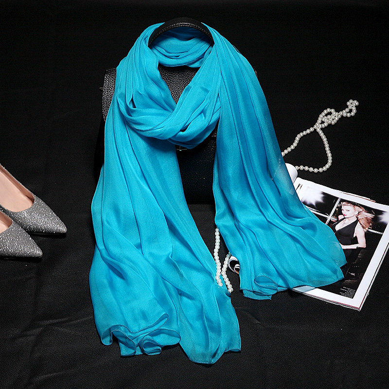 桑蚕丝围巾长款百搭纯色防晒100%高档真丝丝巾女披肩沙滩两用蓝色