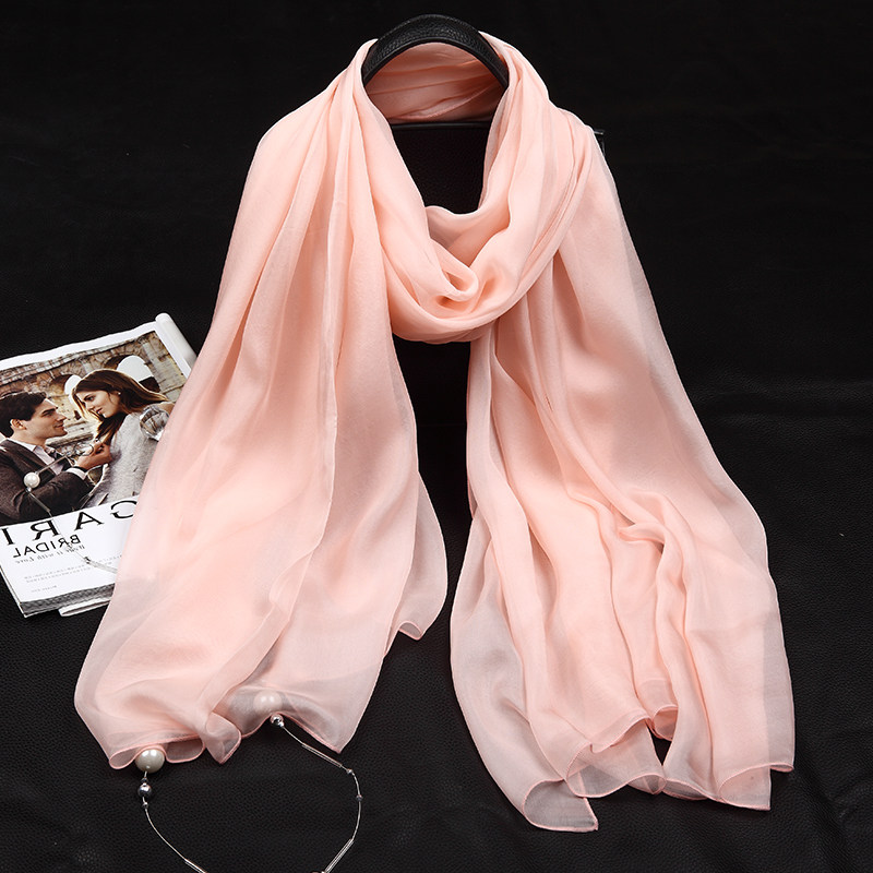 丝巾女时尚珍珠白高档真丝纯色夏季韩版百搭披肩围脖护颈洋气围巾