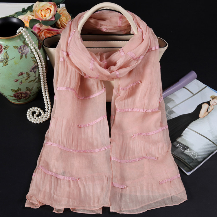 韩国高档纯色钉珠真丝围巾女桑蚕丝巾春秋冬季褶皱亮条披肩粉红色