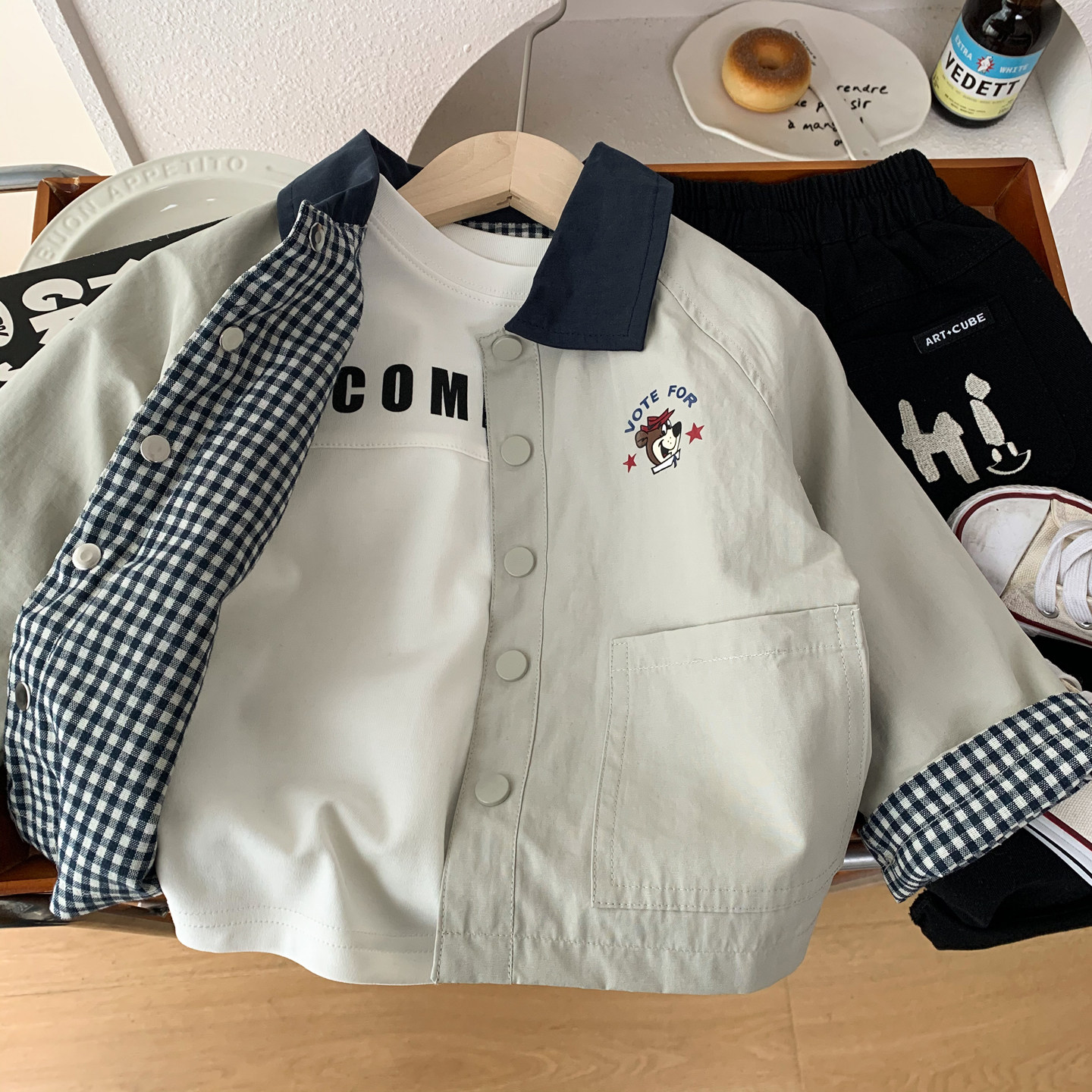男童翻领外套春秋2026新款中小童格子拼接卡通洋气百搭休闲夹克潮