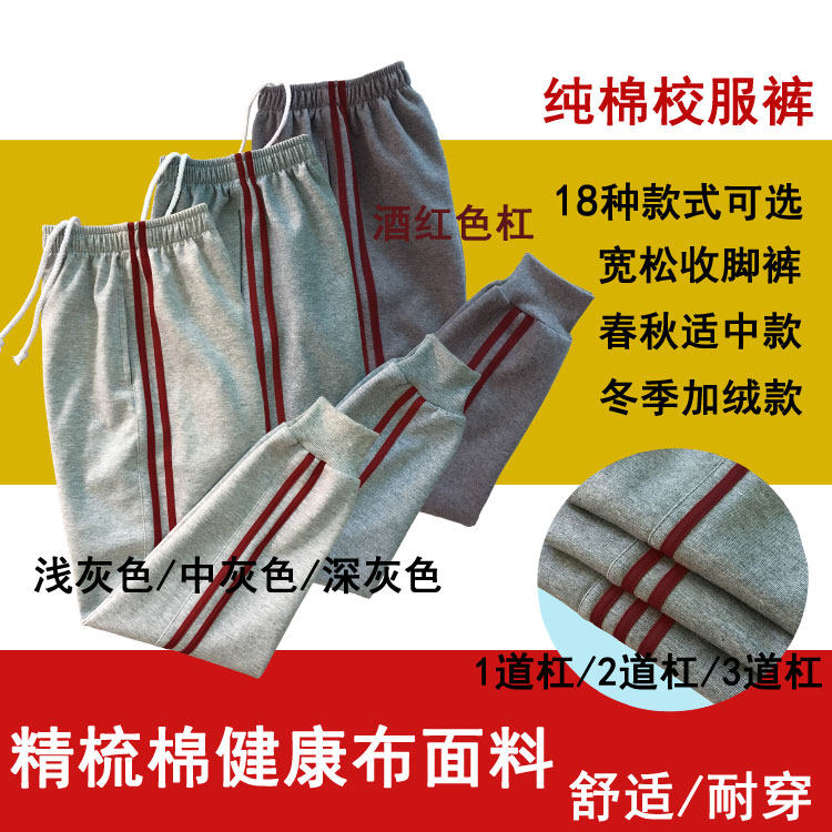 学生裤灰色纯棉裤子酒红色边杠中小学生裤男女收脚运动裤长裤宽松