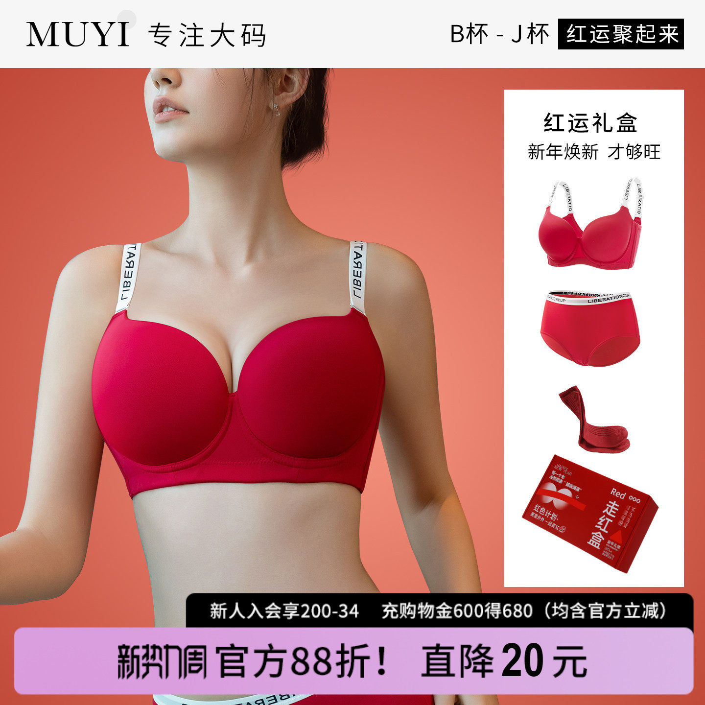 大胸显小文胸罩结婚新娘可拆卸肩带无痕本命年大码红内衣内裤套装