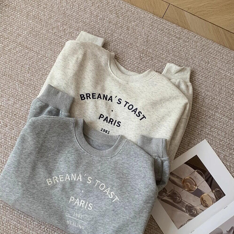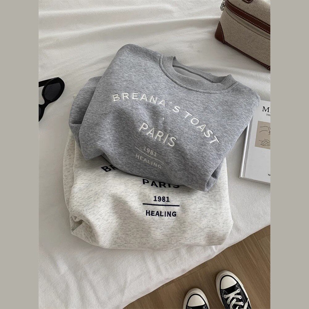BF原宿风字母刺绣卫衣女时髦复古韩系百搭灰色圆领套头上衣25秋冬