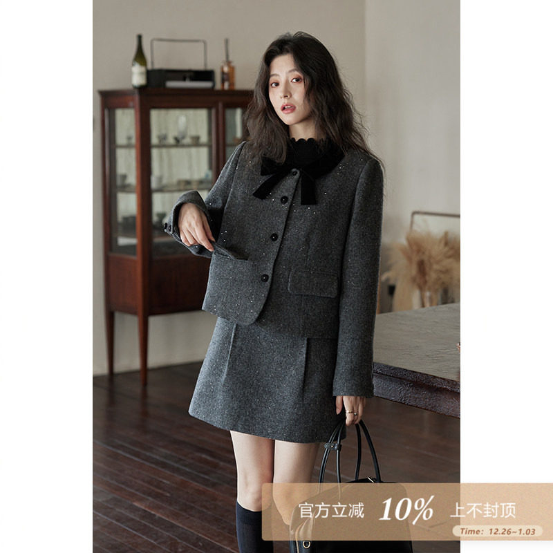 韩系赫本风黑色毛呢套装女秋冬季小个子毛呢外套高腰半身裙两件套