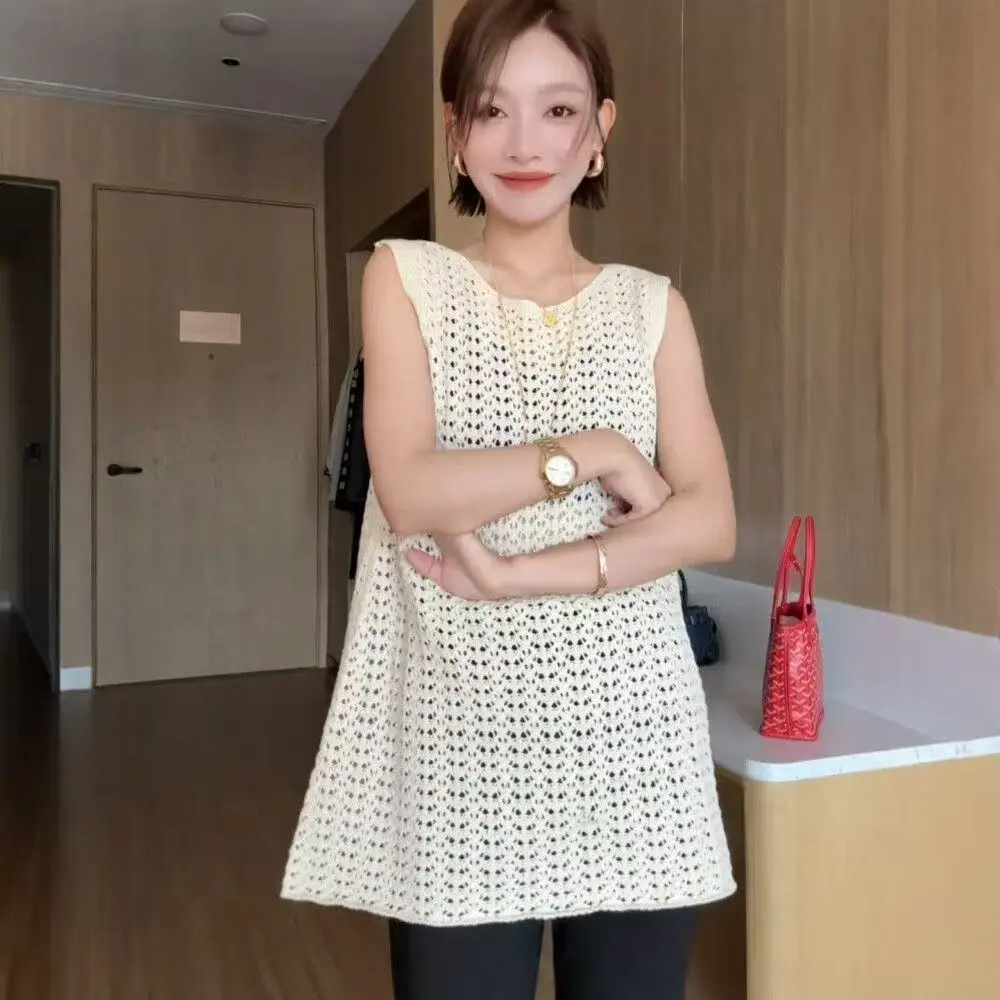 大码女装春夏季胖MM显瘦高级感重工钩花镂空针织无袖背心连衣裙子