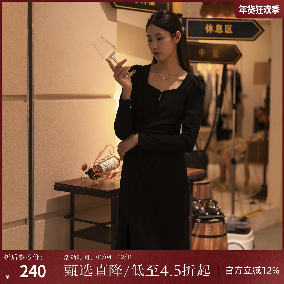 西町村屋连衣裙女秋季新款法式浪漫复古方领开衩连衣裙AC8502011