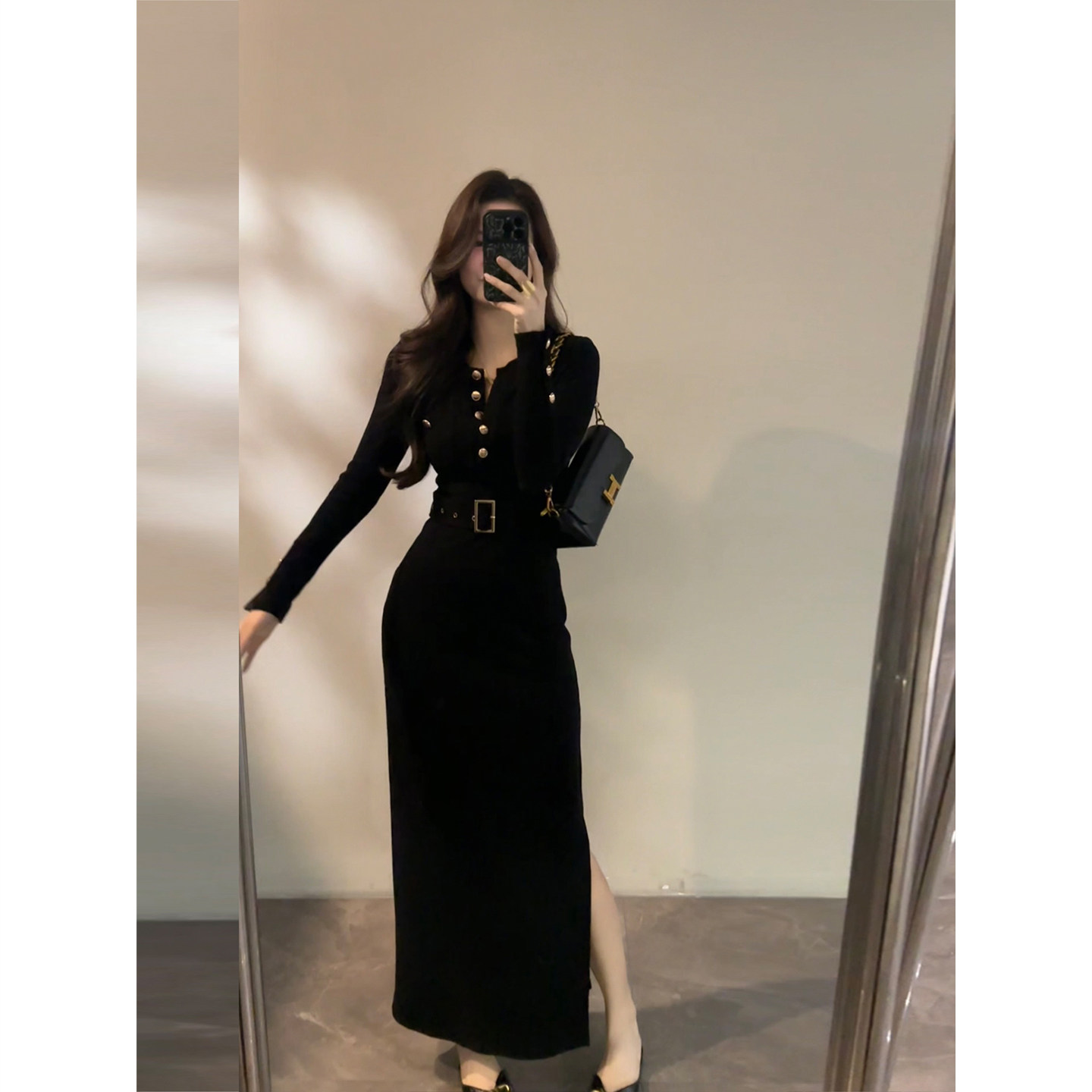 大婷婷 复古纽扣小黑裙气质修身开衩连衣裙长裙送腰带DT1871