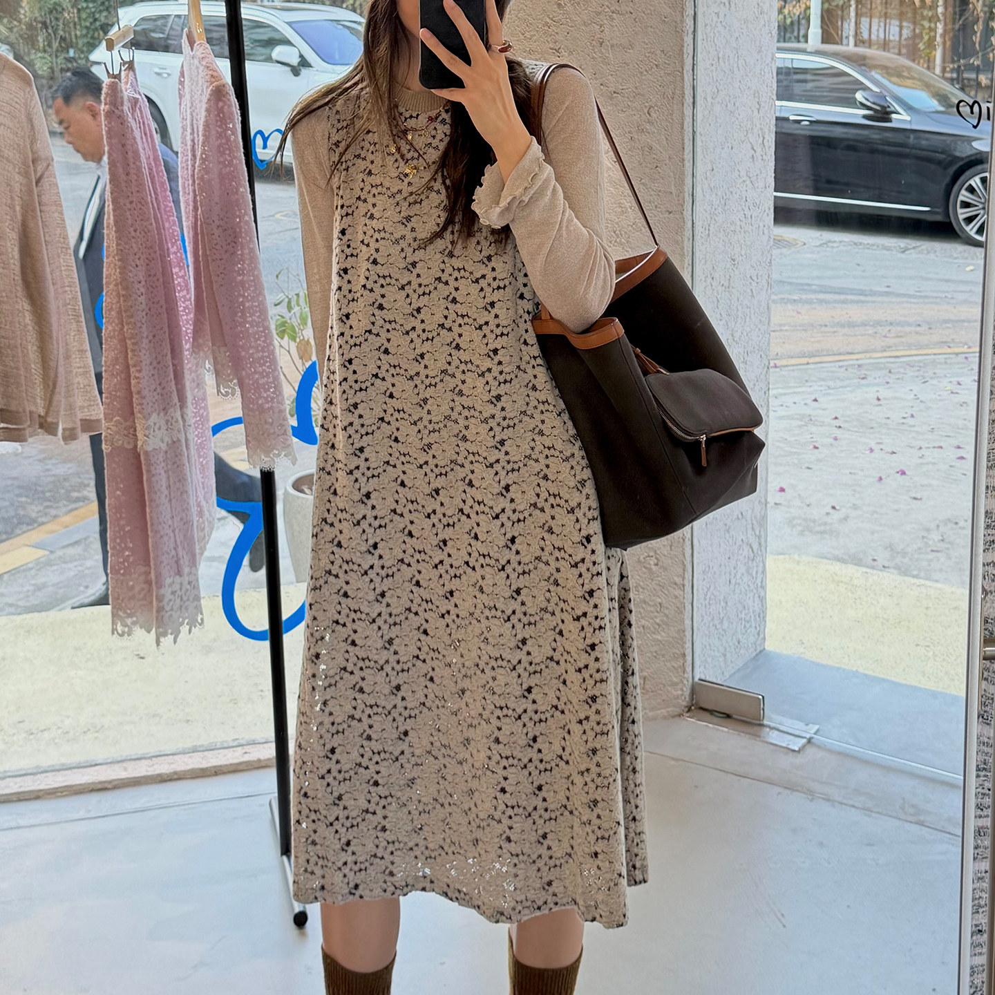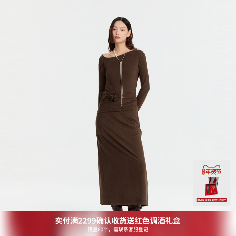 西町村屋连衣裙女冬季文艺感简约翻领开衩针织长裙HD8501298