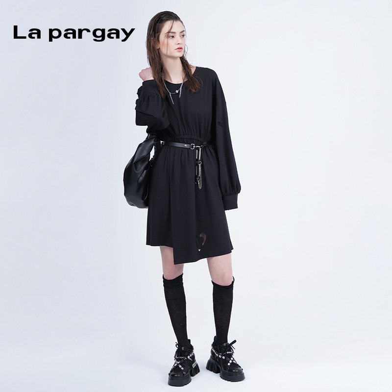纳帕佳套头圆领收腰开衩连衣裙2024春夏新款女式黑色休闲长袖裙子