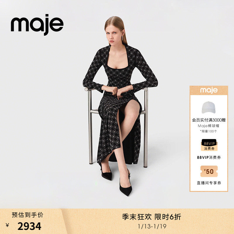季末6折Maje博主同款2025秋冬新款女装法式仿钻饰侧开衩连衣裙