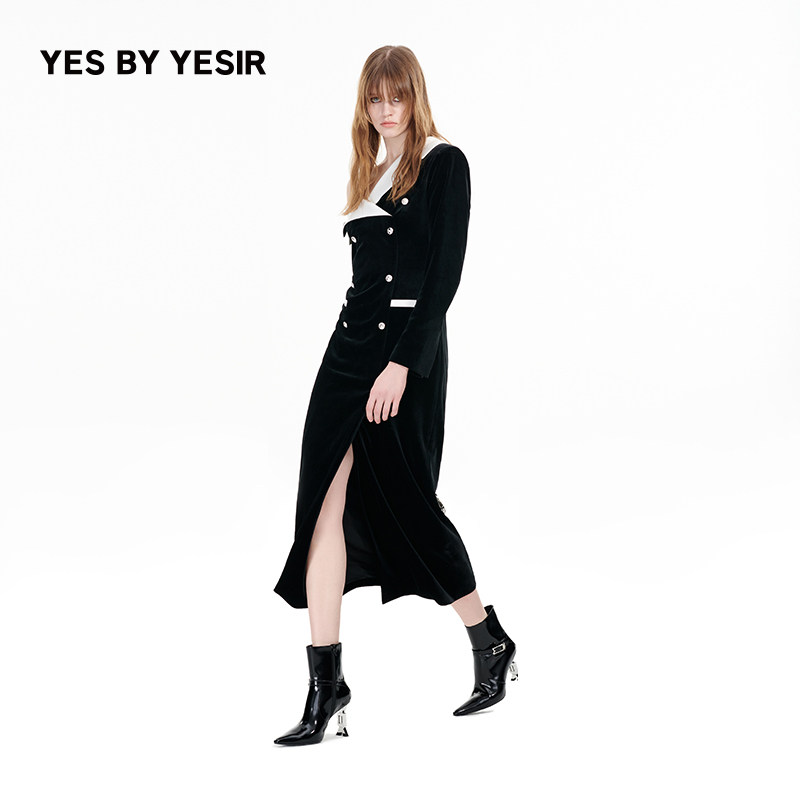 YES BY YESIR叶谦原创设计秋新款律政佳人丝绒轻礼服开衩连衣裙
