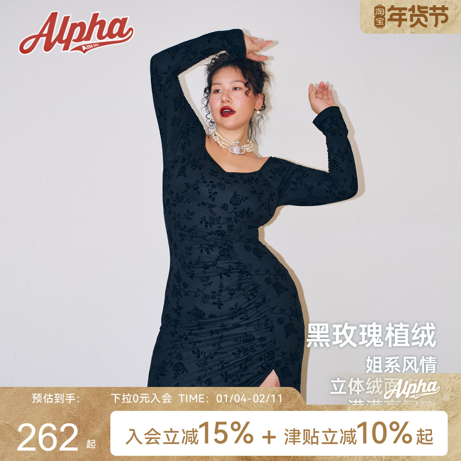 AlphaGym黑玫瑰植绒姐系连衣裙带胸垫丝绒新中式开衩长袖复古裙