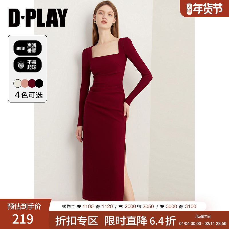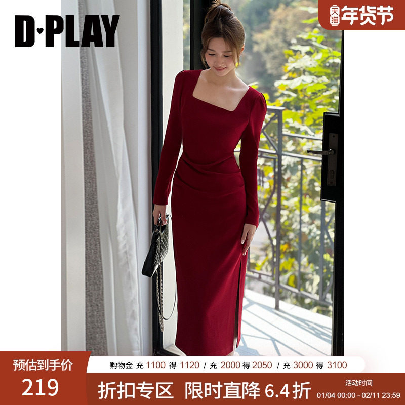 DPLAY秋季法式复古果酱红方领捏褶侧开衩连衣裙订婚服敬酒服