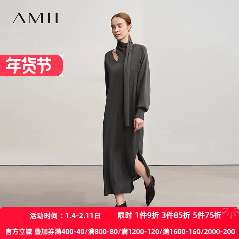 Amii2025冬新款纯色宽松长弹力薄羊毛精梳纱连领围巾开衩连衣裙
