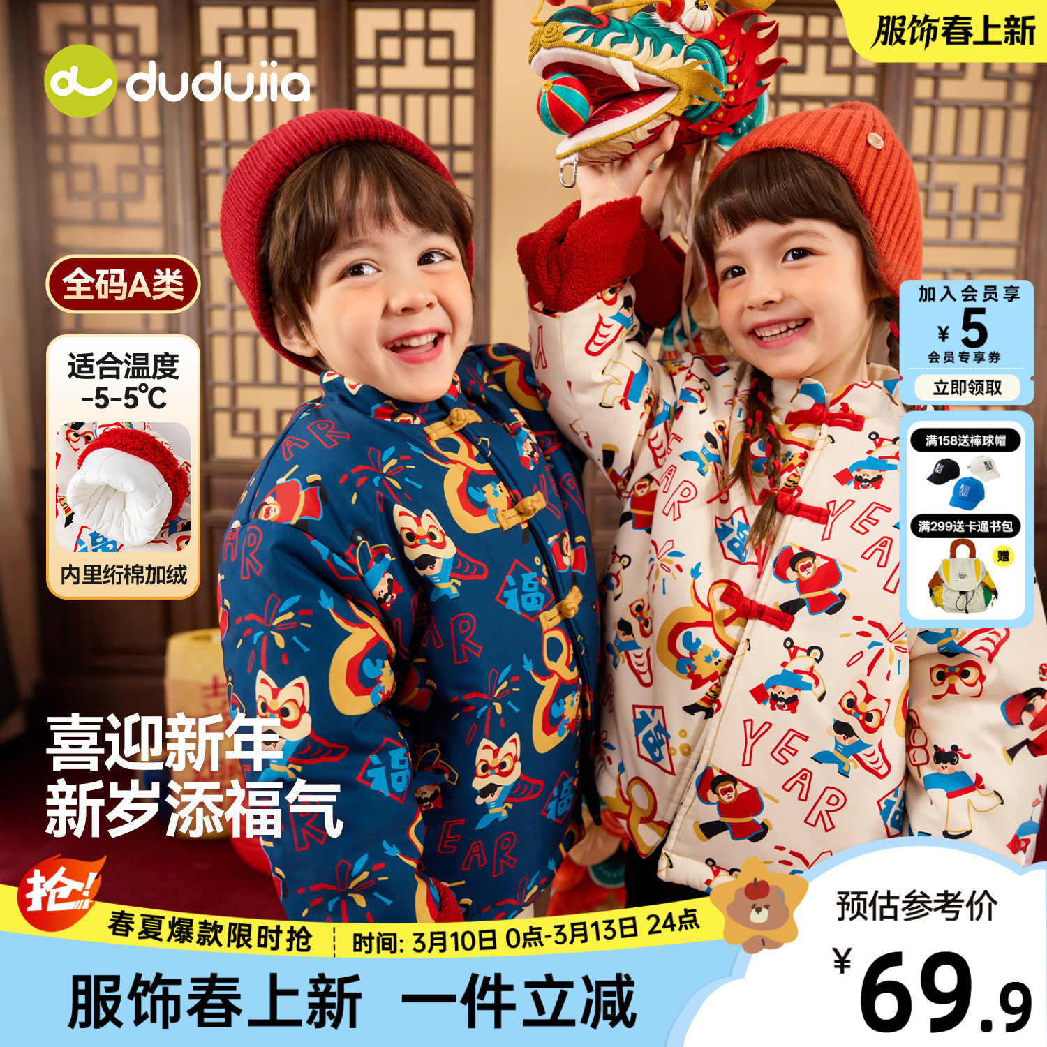 嘟嘟家男童国风外套儿童拜年服宝宝棉服年装红色新中式女童唐装新