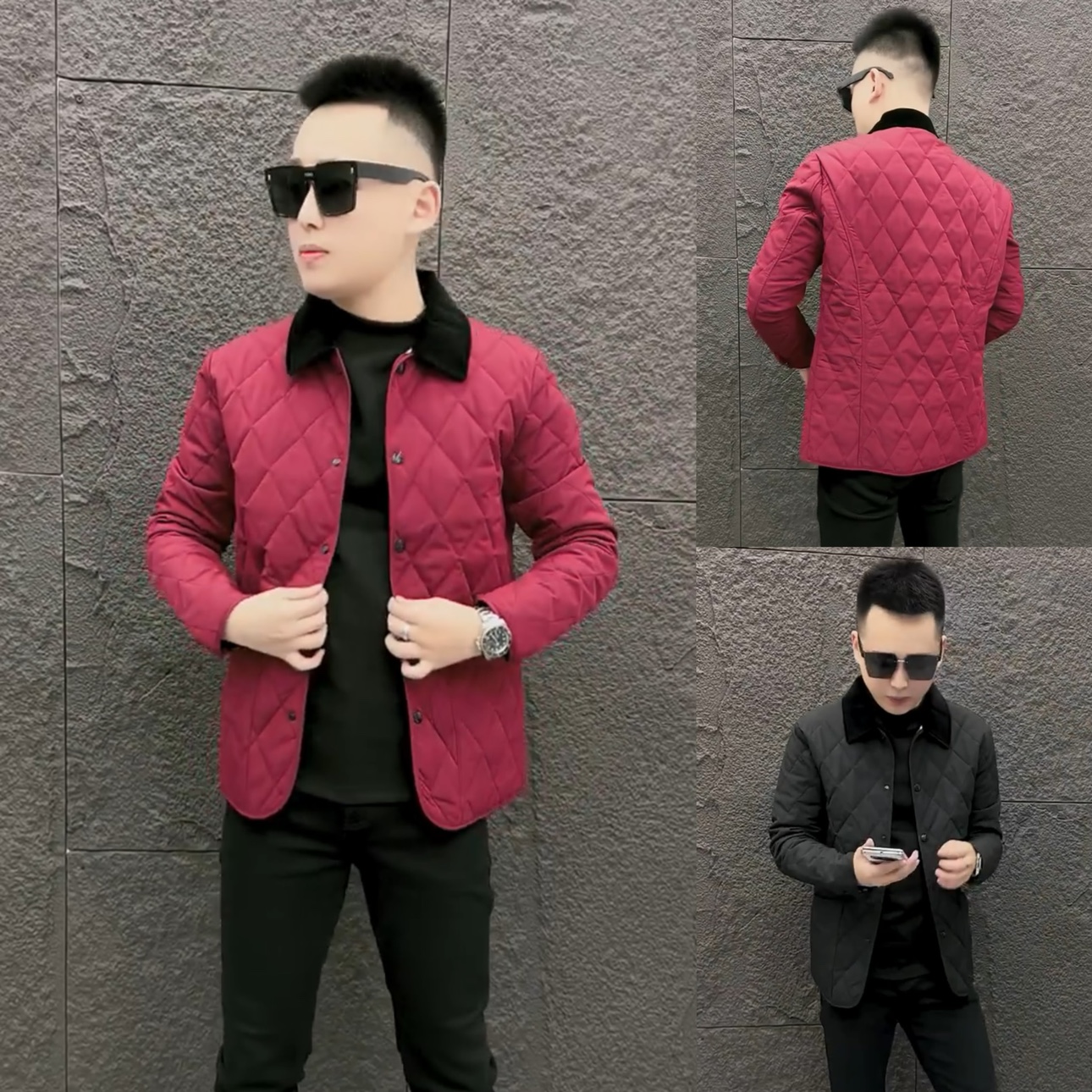 菱形格商务休闲棉服西装领薄棉衣外套时尚简约修身秋冬男单西D41